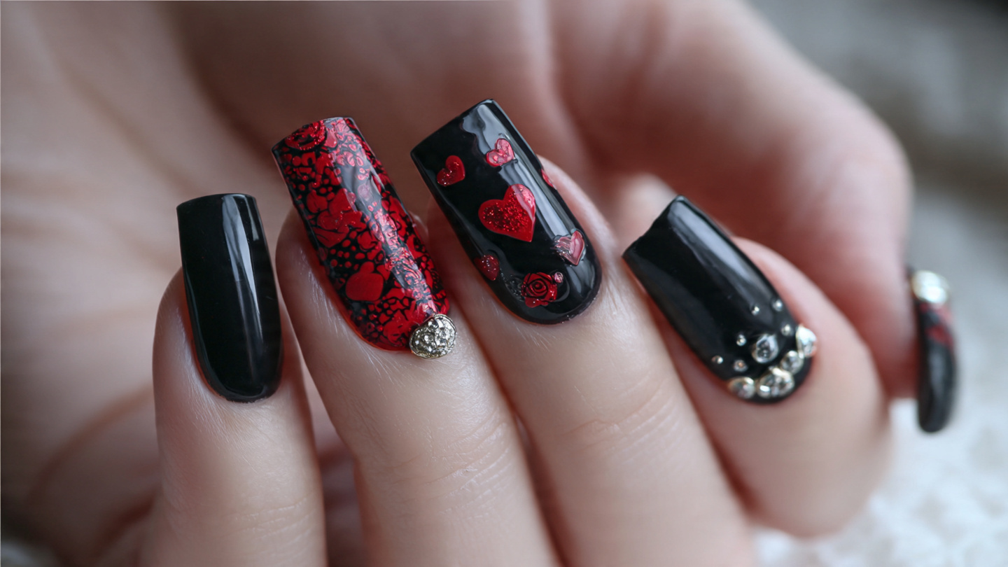 Use stamping plates or hand-paint lace patterns for authentic detailing that resembles actual fabric. The transparency beneath the black lace creates depth and dimension that solid colors cannot achieve. This Valentine’s look suits those who appreciate vintage aesthetics and the romantic darkness of gothic style.
